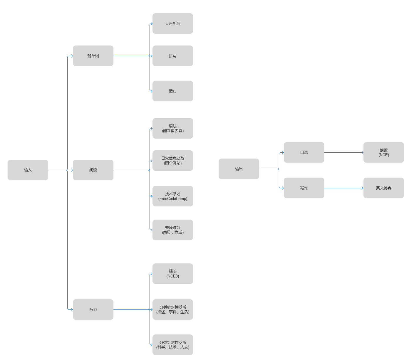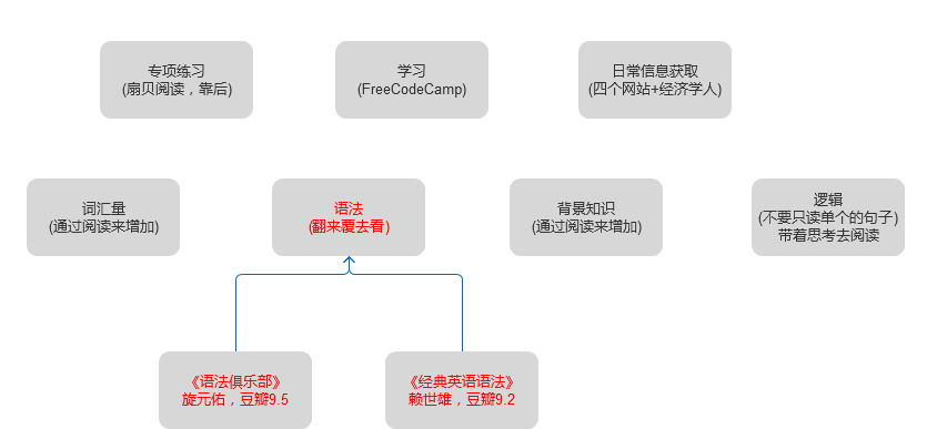 类似架构图,我需要明确自己所需的能力(比如听力)是由哪些基础技能、资料和练习支撑起来的,然后再针对性的进行锻炼,避免空泛而迷茫的低效练习。