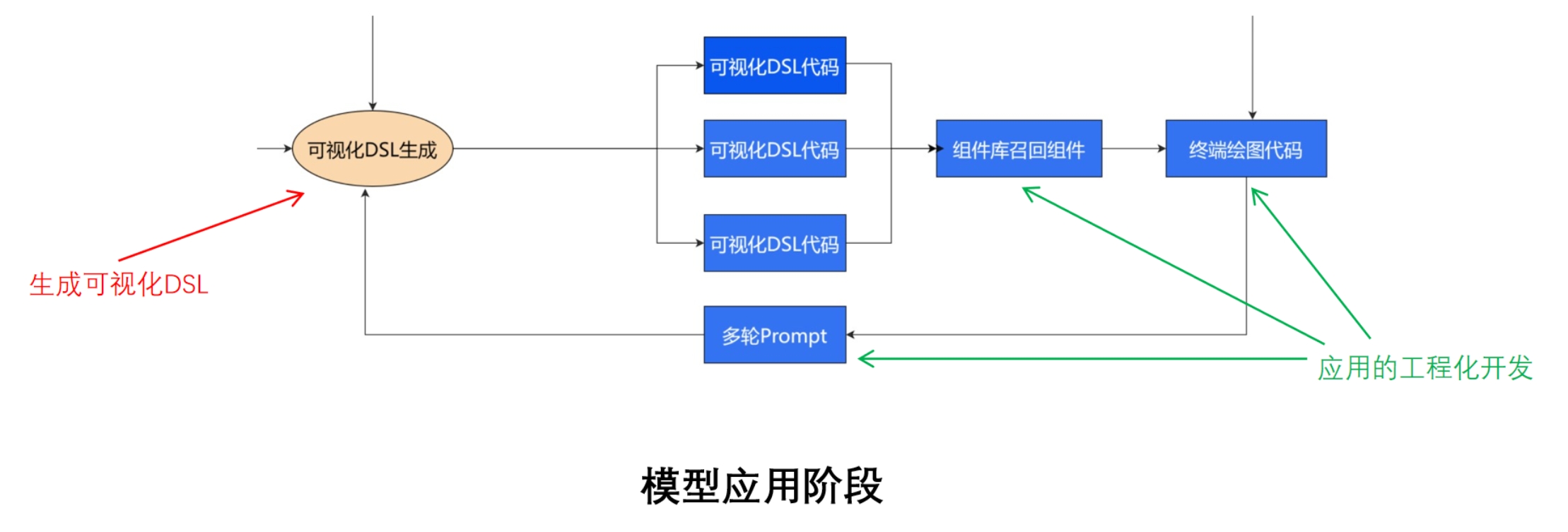 在模型应用阶段,由大模型和开发人员协作进行。开发人员所需要处理的工作包括根据大模型生成的 DSL,进行组件库代码的召回、终端绘图页面的开发、以及多轮 Prompt 等辅助功能的开发:
