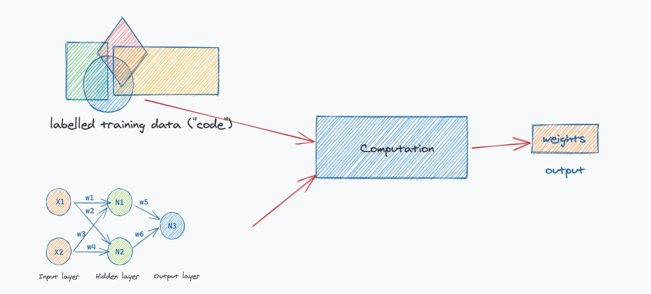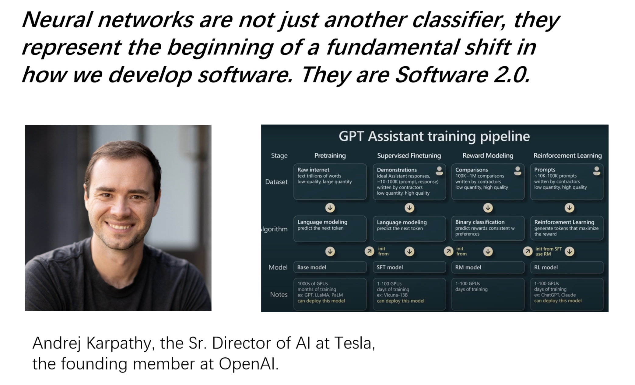 2018 年由 Andrej Karpathy 提出的软件 2.0 阶段,引入了神经网络,追求自动化,开发人员的重心是处理模型训练数据: