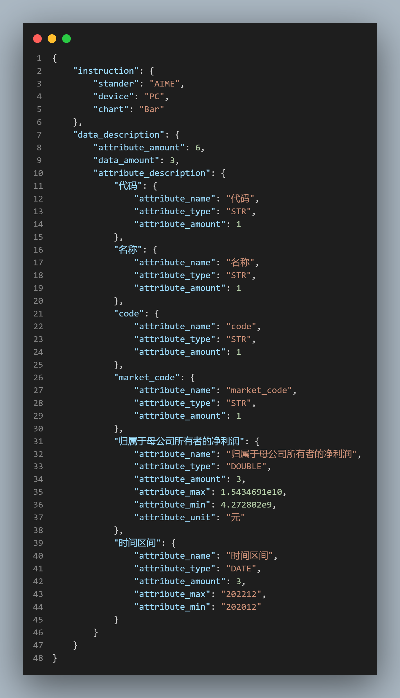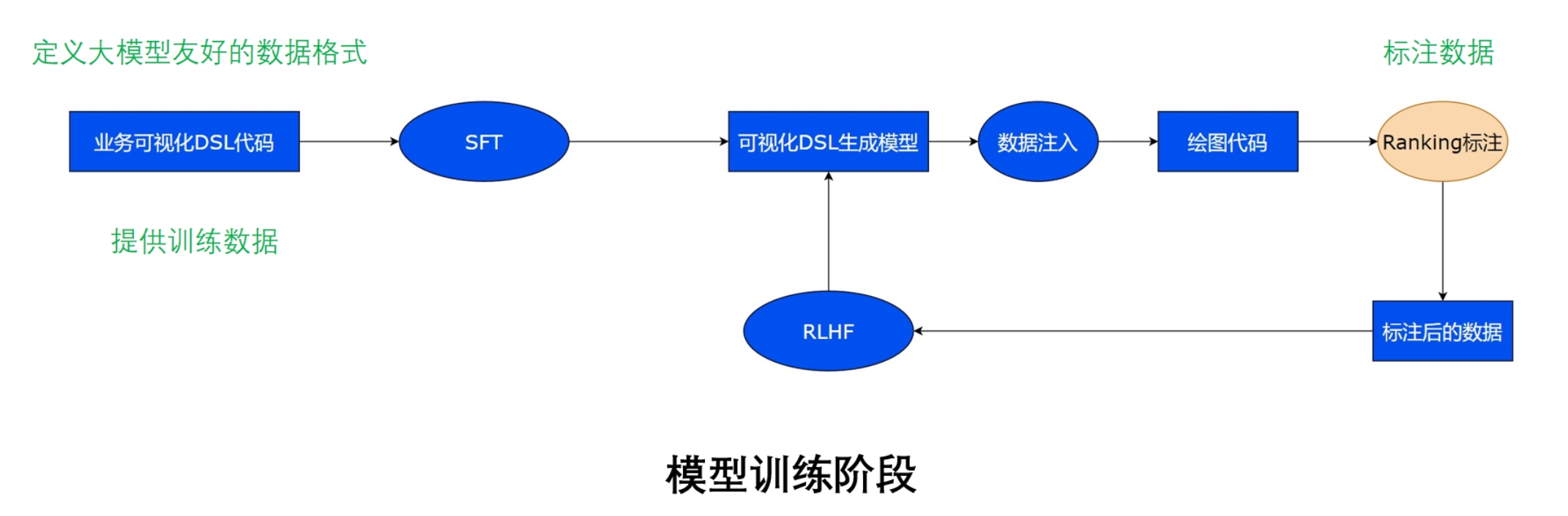 接下来我们需要设计大模型友好的数据格式,以生成数据可视化为例,大模型并不适合一步到位生成最终的可视化绘图代码,其更适合处理的是生成可视化的 DSL 描述代码。我们需要将他生成的信息设计成结构化、高抽象度、低复杂度的格式,并且需要保证训练数据的多样性。