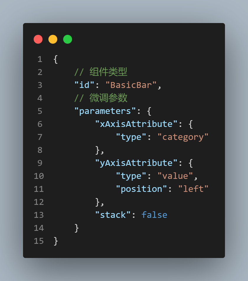· parameters 用于实现效果的微调,模型会针对不同的情况返回不同的视觉和交互的微调参数(比如上图中的 xAxisAttribute),该字段的值可以根据实际场景进行扩展;