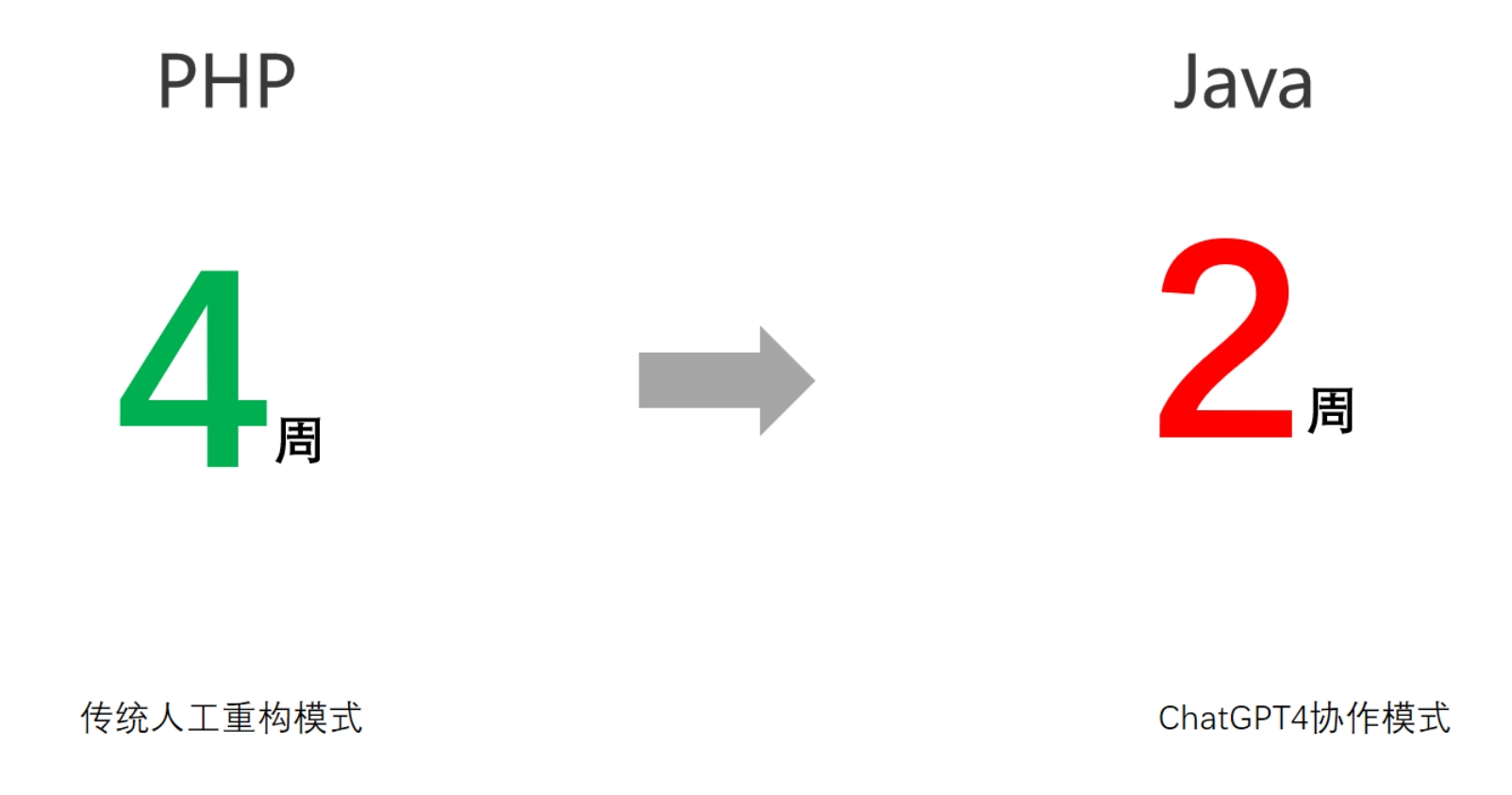 我们公司之前大量的后端服务都是用 PHP 编写的,从 2018 年开始公司转向 Java,这就涉及大量的 PHP 代码转写为 Java 代码。资讯的同事采用 ChatGPT4 进行了资讯种子平台项目的转写,将原本需要四周的工作量缩减到两周就完成了。